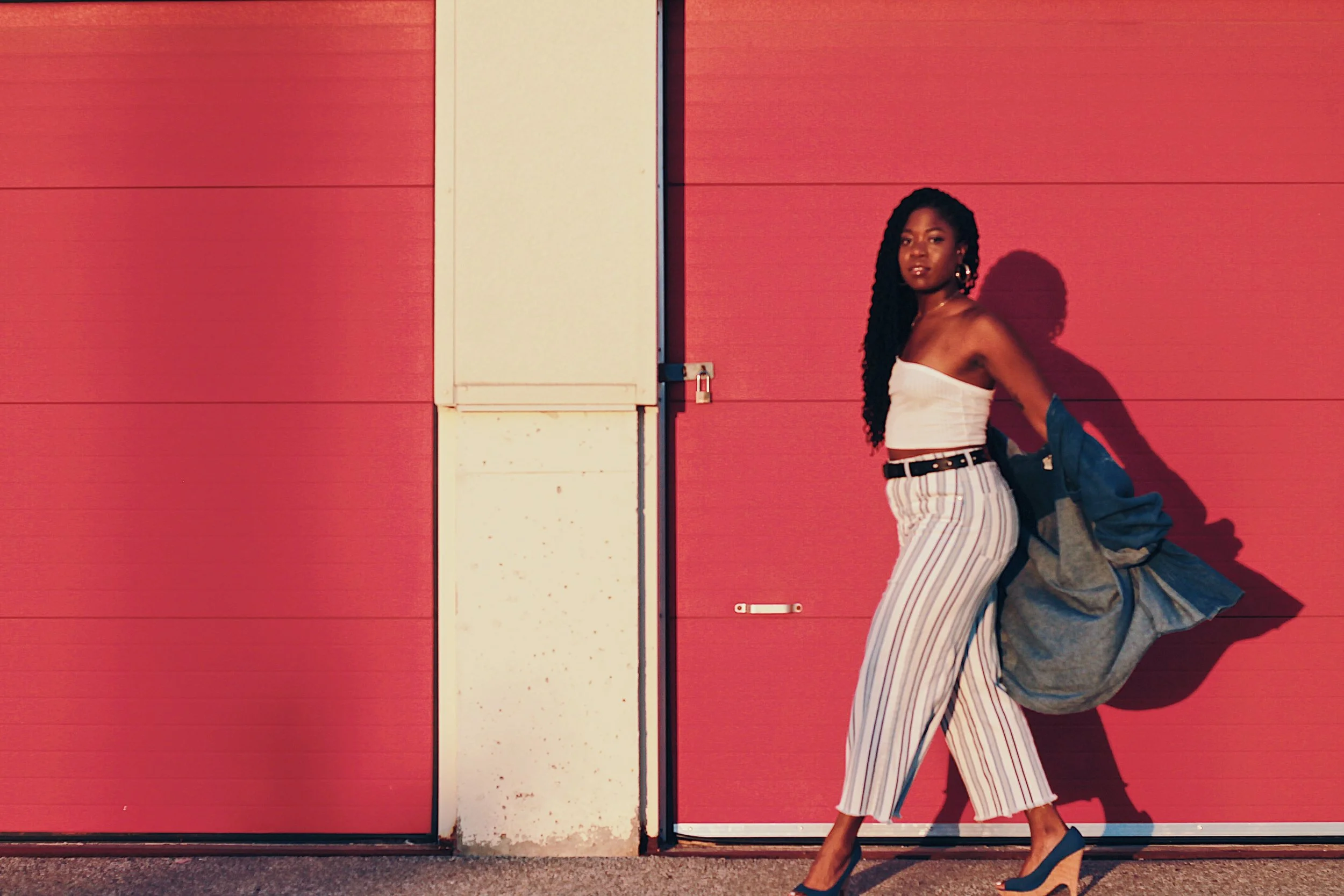 zara off-the-shoulder top // h&m cotton culottes // vintage denim jacket + heels